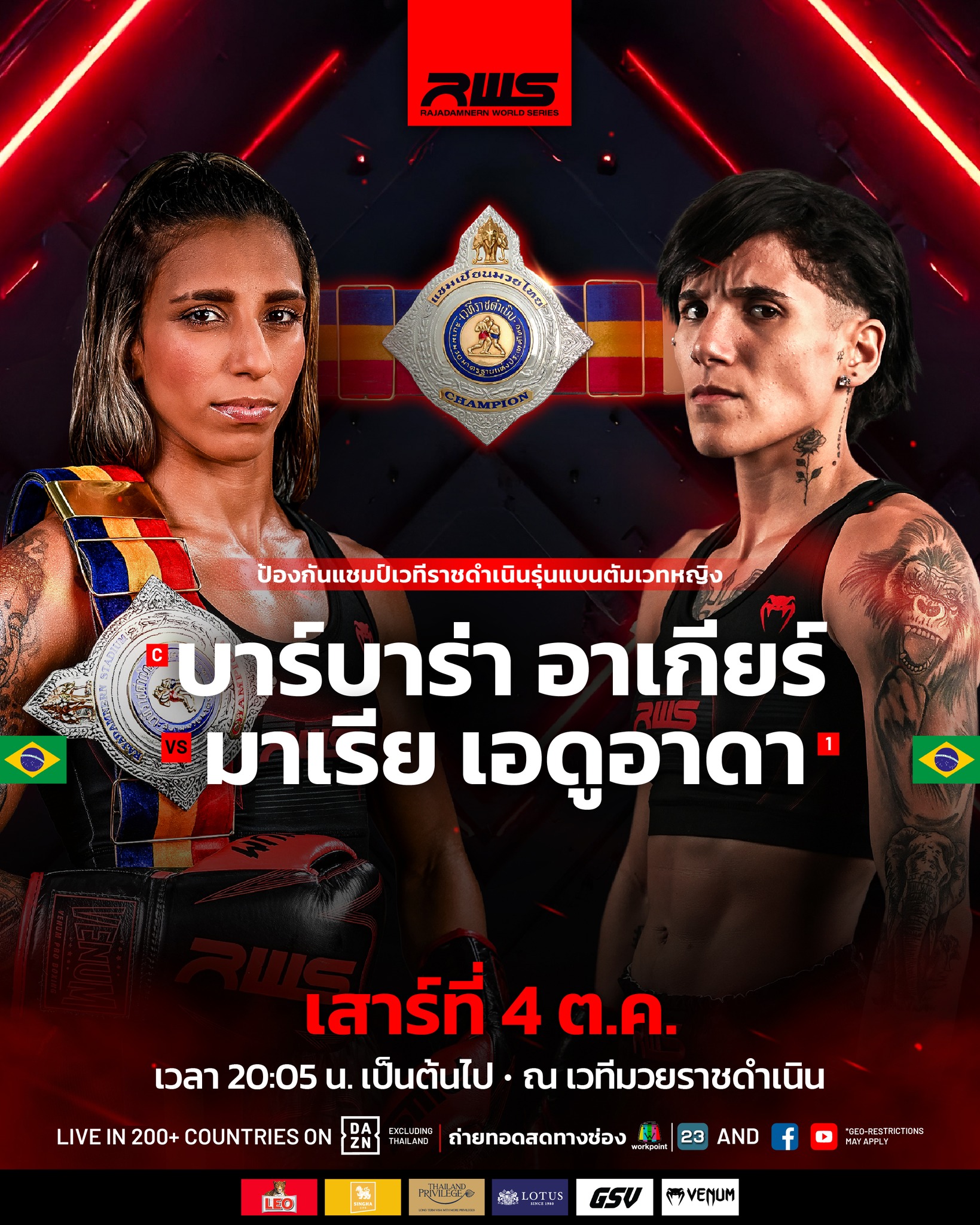 ผ่านการชั่งน้ำหนักตัวอย่างเป็นทางการ ศึก RWS - Rajadamnern World Series เมื่อช่วงสายของ วันศุกร์ที่ 26 กันยายนที่ผ่านมา สำหรับ ศึกป้องกันแชมป์รุ่นแบนตั้มเวตหญิง 118 ปอนด์ ระหว่าง บาร์บาร่า อาเกียร์ กับ มาเรีย เอดูอาร์ดา โดย บาร์บาร่า อาเกียร์ ไม่สามารถทำน้ำหนักตามพิกัดได้ทำให้ หมดสิทธิ์รับโบนัส โดยจะตะบันหน้ากัน วันพรุ่งนี้(เสาร์ที่ 4 ตุลาคม 2568) เวทีมวยราชดำเนิน พร้อมมวยประกอบรายการชั้นนำมากมาย ซาจ๊าด ซัตตารี่, แสนพล, เพชรธงชัย และ สิงห์บุรี